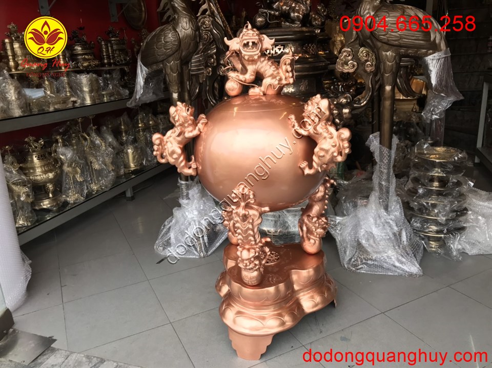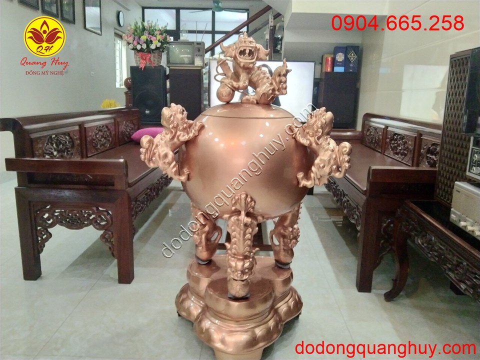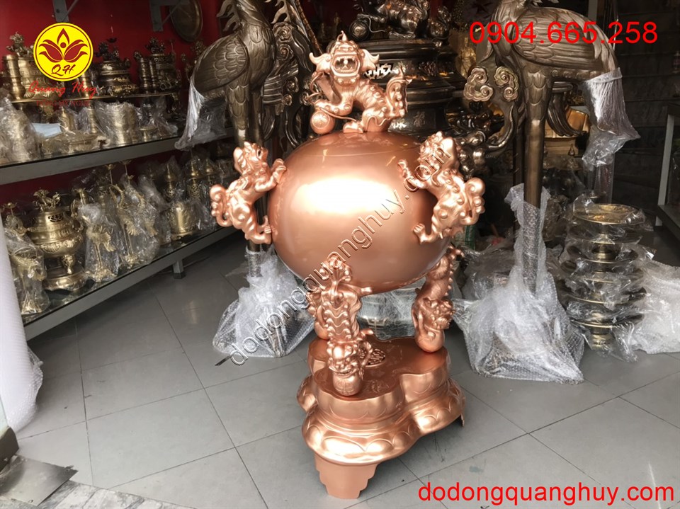 Đỉnh thất lân vờn cầu nguyên màu đồng đỏ là đồ mỹ nghệ cấp, giàu ý nghĩa phong thủy, phù hợp với không gian thờ cúng, thể hiện nét đẹp văn hóa tâm linh của người Việt.