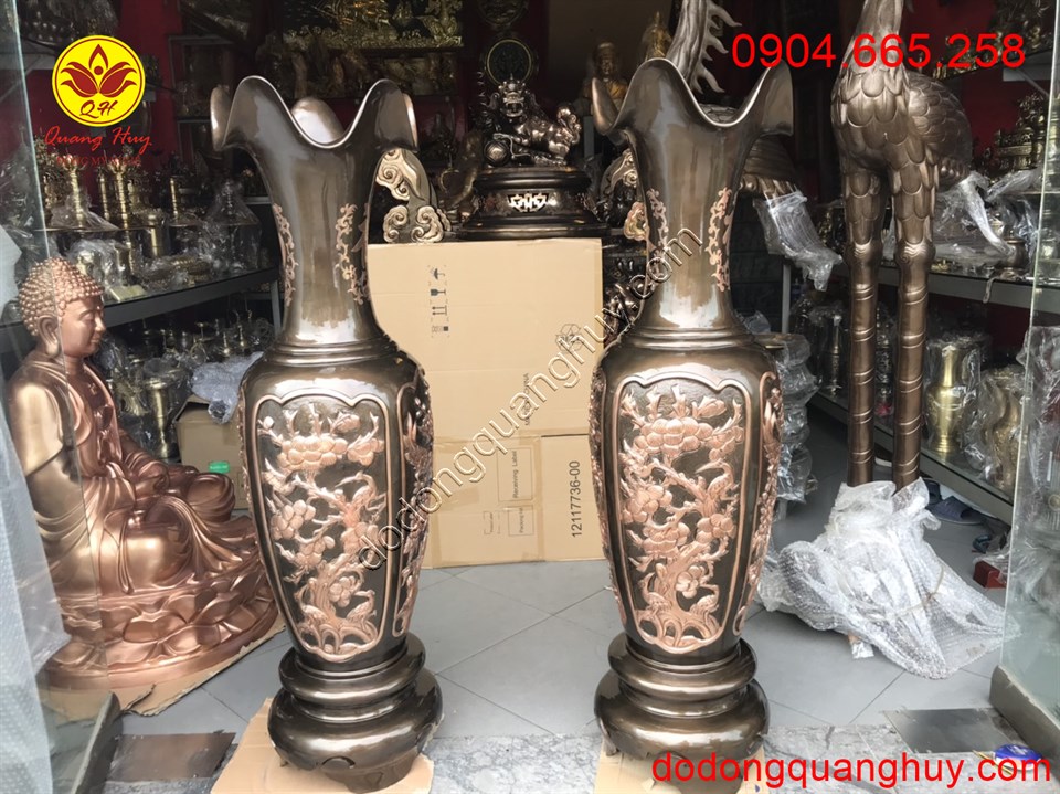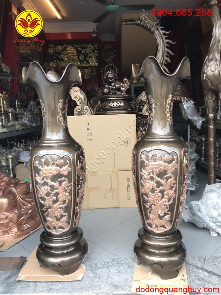 Đôi Lục Bình bằng đồng đỏ hoa văn tứ quý cao 1m27