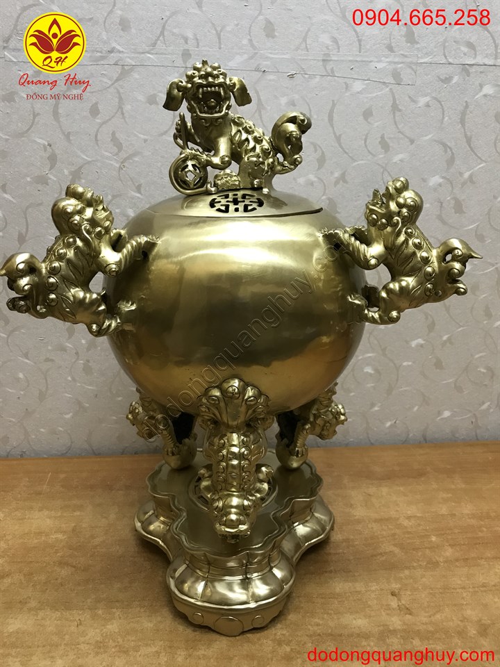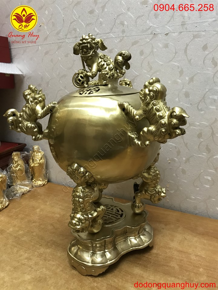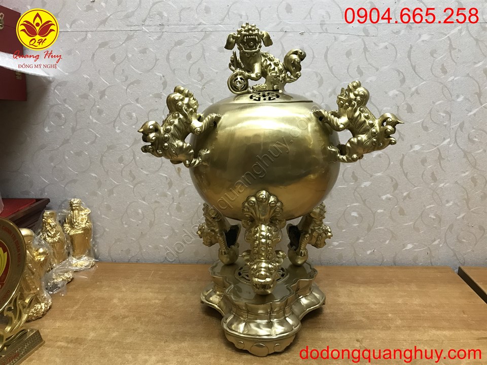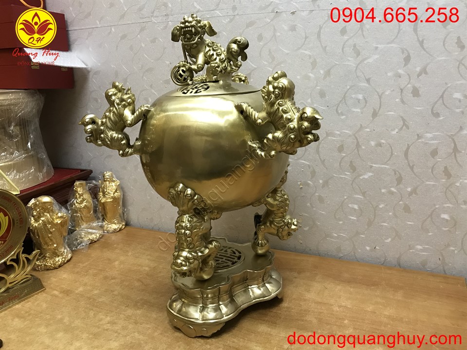 Đỉnh thất Lân Vờn Cầu cao 60cm được đúc bằng đồng vàng hoa văn tinh giản, không quá cầu kỳ nhưng lại rất được khách hàng ưa chuộng.