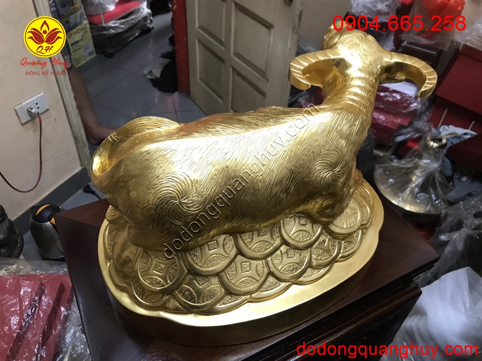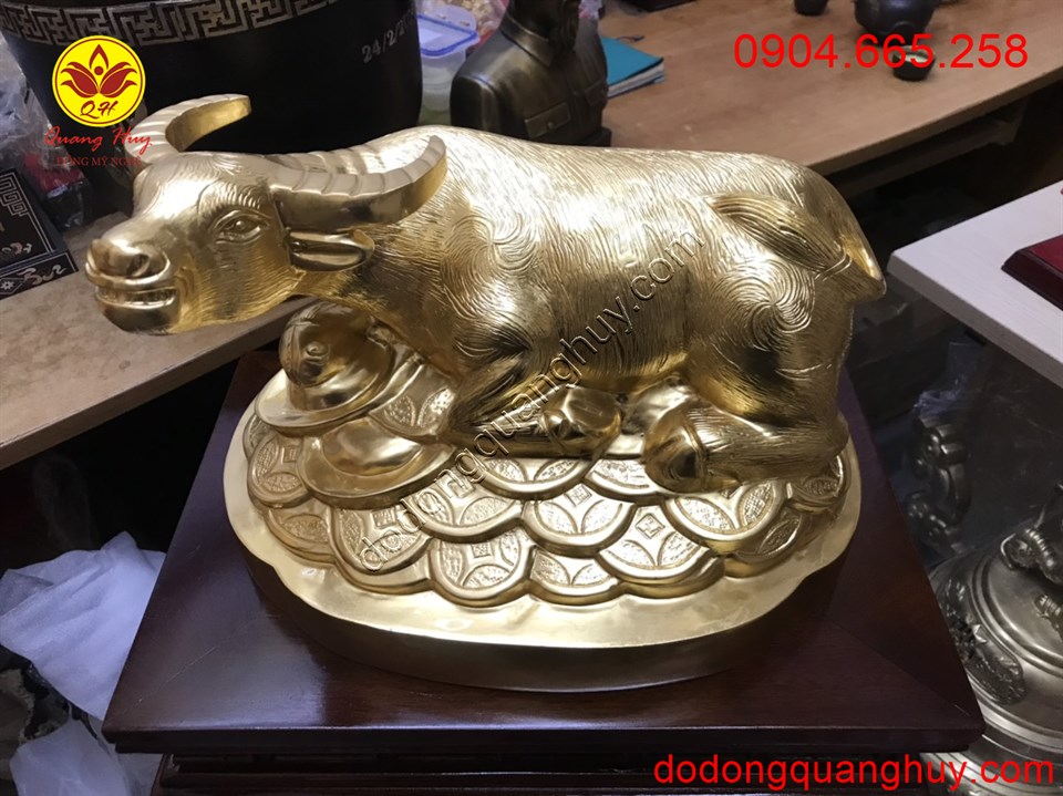 Tượng trâu đồng nằm trên tiền vàng được đúc bằng đồng đỏ dát vàng 9999 dài 40cm là mẫu trâu phong thủy đẹp mang lại may mắn tài lộc cho gia chủ. Hãy đến với chúng tôi !