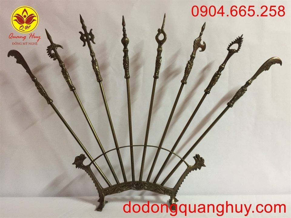 Mục đích sử dụng:Bộ bát biểu 60cm làm bằng đồng hun xanh giả cổ với 8 loại vũ khí được bày trên một giá hình giẻ quạt với mục đích để thể hiện quyền uy sẽ làm tăng thêm sự uy nghi trên bàn thờ gia tiên của gia chủ hay đền, đình chùa…..