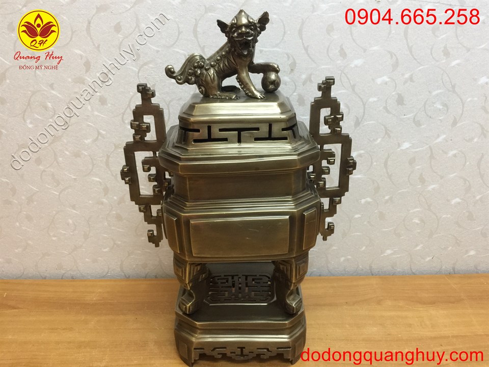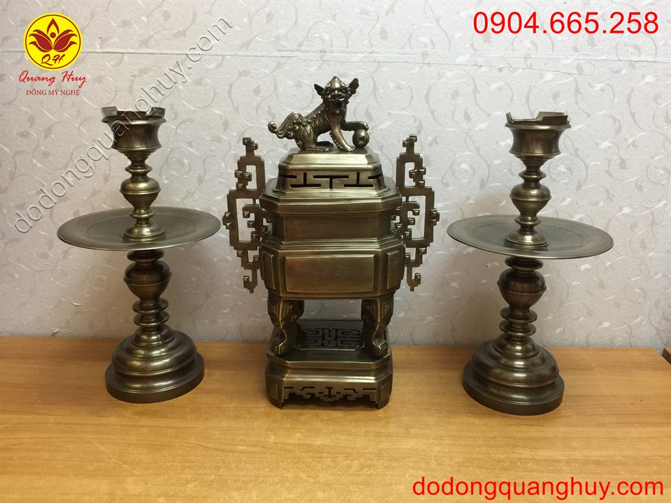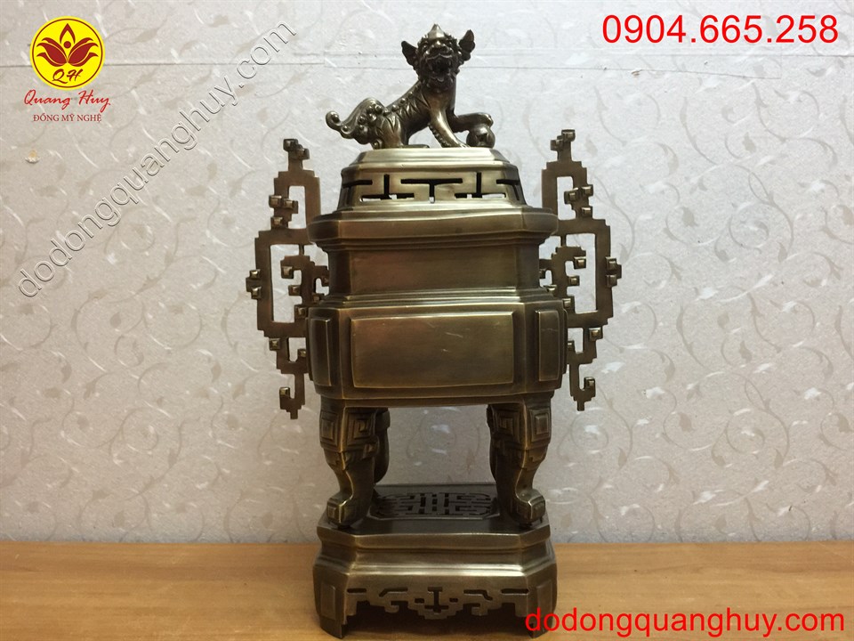 Hình thức: Đỉnh đồng có hình vuông.Trên nắp đỉnh có con nghê ngậm ngọc vờn quả cầu. Hai tai mây có hình dáng tai mây, tai rồng. Đỉnh là một tuyệt phẩm trong đồ thờ mang đậm văn hóa truyền thống.Đỉnh đồng vuông kết hợp với đôi chân nến, đôi hạc cao 55cm thành bộ ngũ sự đỉnh vuông bằng đồng hun xanh giả cổ cao 55cm. Bộ ngũ sự cao 55cm hợp với bàn thờ kích thươc 1m8 trở xuống.