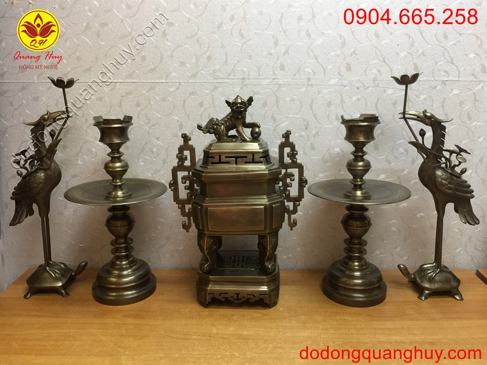 Màu sắc và sử dụng: Bộ ngũ sự coa màu hun xanh cổ kính tạo nên chiều sâu của bộ đồ thờ. Được sử dụng phổ biến trong phòng thờ gia tiên, cơ quan đoàn thể…