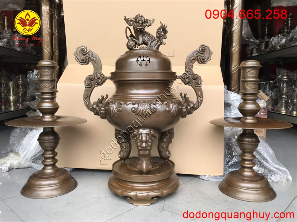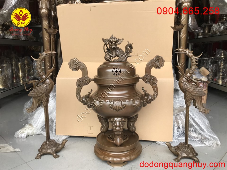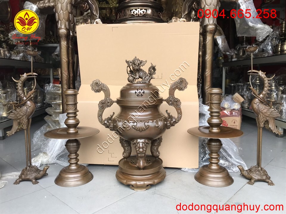 kích thước: Bộ ngũ sự bằng đồng hun xanh giả cổ cao 70cm gồm đỉnh cao 70cm, đôi hạc cao 70cm, đôi chân nến cao 60cm