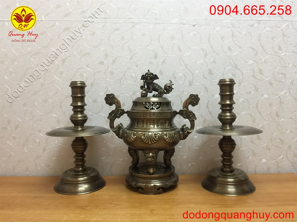 kích thước: Bộ ngũ sự bằng đồng cao 40cm gồm một đỉnh ,đôi hạc, đôi chân nến .