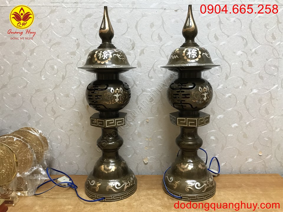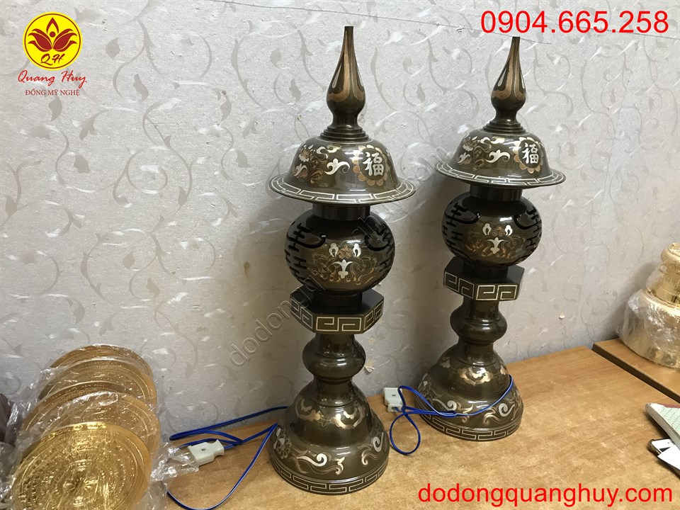Đèn thờ bằng đồng khảm tam khí cao 60cm sắc nét và tinh xảo