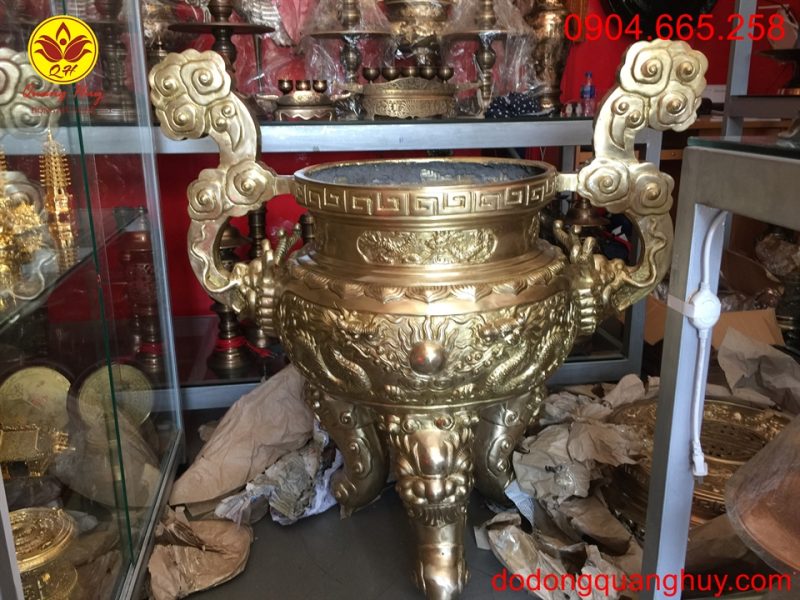 Đỉnh đồng rồng nổi cao 1m27 nguyên liệu bằng đồng vàng nguyên chất đúc thủ công. Đỉnh đồng 1m27 được dùng ở từ đường, nhà thờ, đình chùa…Đồ đồng Quang Huy xin giới thiệu tới quý khách một số hình ảnh đỉnh đồng vàng rồng nổi :