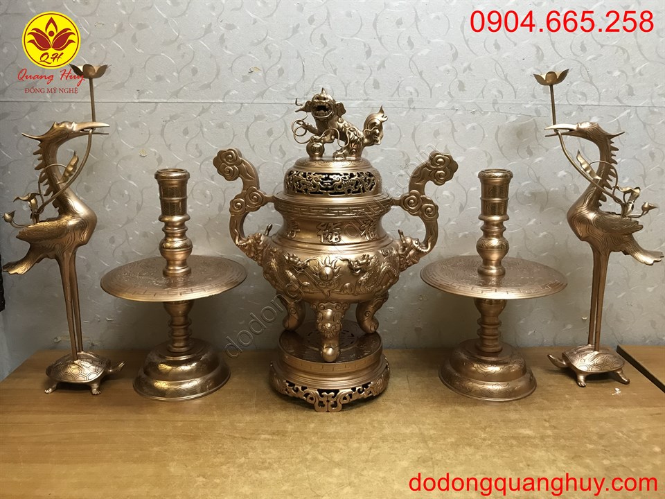 Bộ ngũ sự Rồng cao 60cm gồm một đỉnh, hai chân nến, hai ông Hạc phù hợp với bàn thờ 1m97 trở đi .