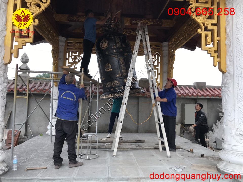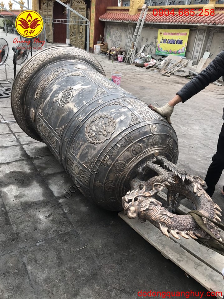 + Kích thước: chuông đồng cao tổng thể khoảng 2m2, đường kính miệng khoảng 1m.
