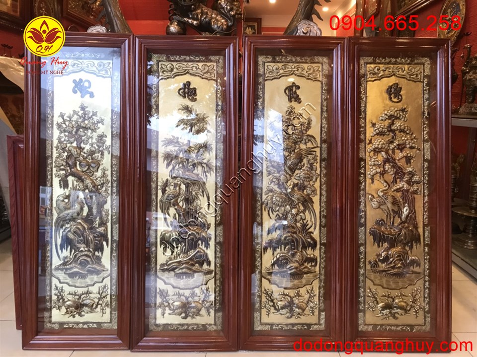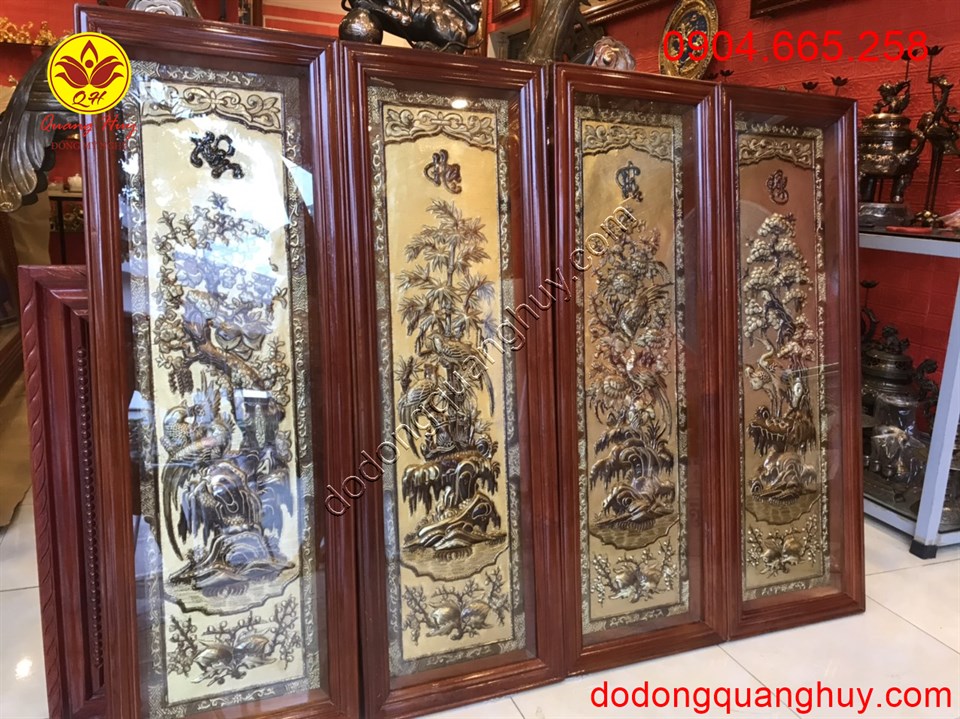 Bộ Tranh Tứ Quý Bằng Đồng Vàng Cao Cấp của đồ đồng Hoàng gia là một bức tranh đồng mỹ nghệ miêu tả cảnh 4 mùa xuân hạ thu đông. Treo tranh trong nhà không chỉ giúp trang trí không gian sống mà nó còn mang ý nghĩa phong thủy sâu sắc