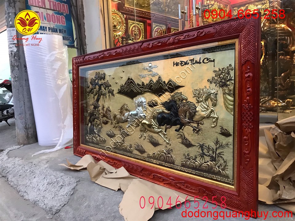 Kích thước : tranh mã đáo thành công kích thước thường 1m55x80, 1m7x90, 2m3x1m2… đồ đồng Quang Huy chuyên nhận chế tác tranh theo mẫu mã và kích thước theo quý khách yêu cầu.