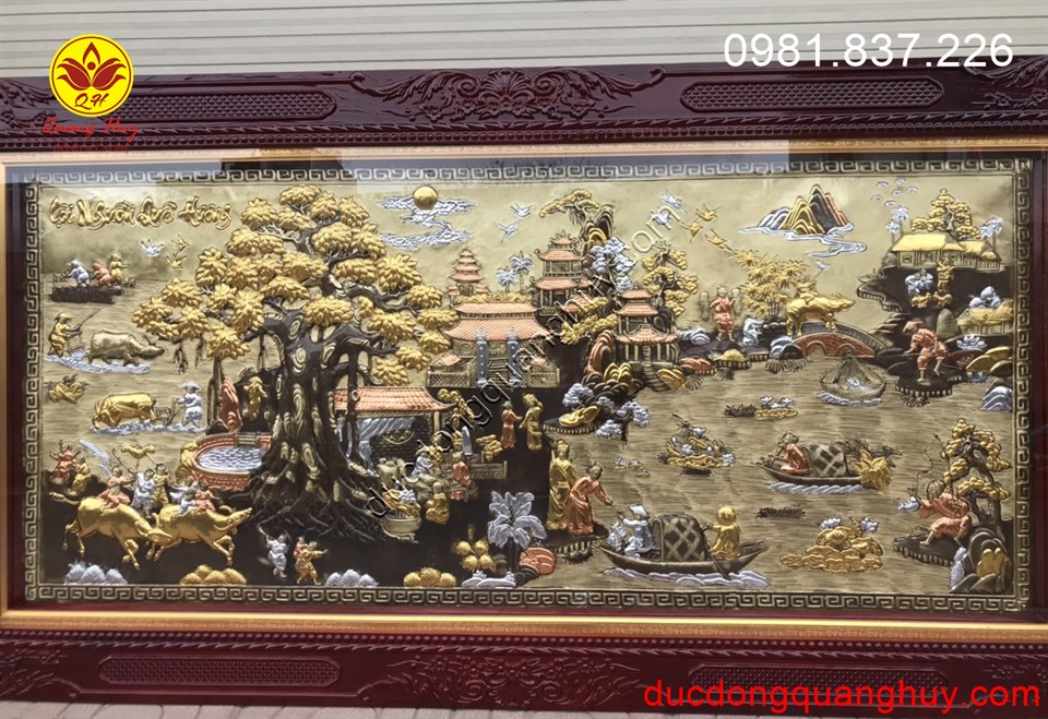 Tranh cội nguồn Quê Hương bằng đồng nguyên chất thúc thủ công hoa văn sắc nét và tinh xảo. Đây là mẫu tranh rất được ưa chuộng gồm đồng vàng, vàng , Bạc tạo nên điểm nhấn nổi bật, sang trọng và ý nghĩa trong phòng khách, phòng làm việc.Tranh khắc hoạ hình ảnh của cây đa, giếng nước, sân đình. Không thể thiếu cảnh sinh hoạt lao động của người dân. Đây chính là những hình ảnh đặc trưng chỉ có ở làng quê. Những hình ảnh, chi tiết này gợi nhớ thời thơ ấu, tạm gác lại những lo toan, bộn bề của cuộn sống hiện đại bây giờ.