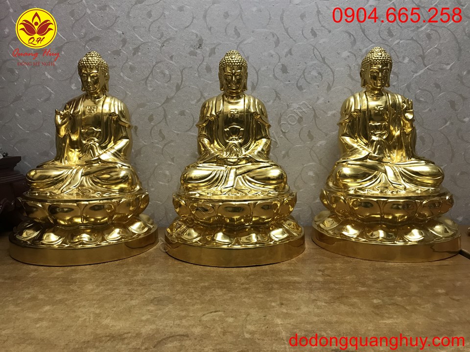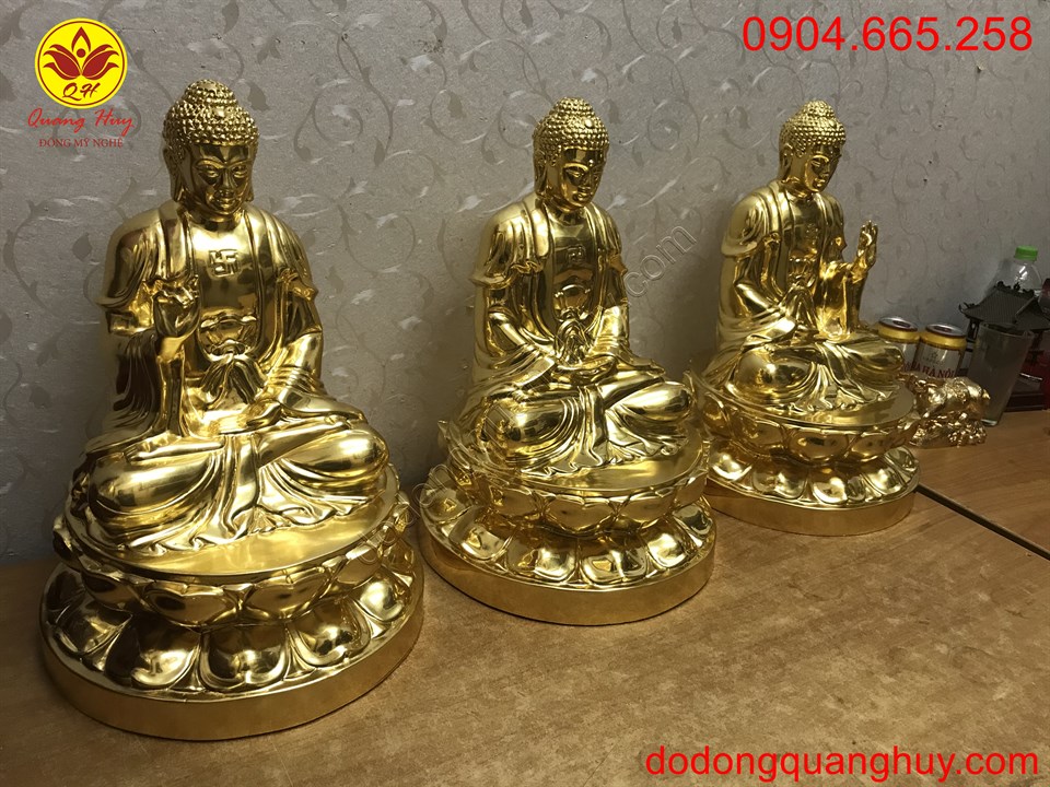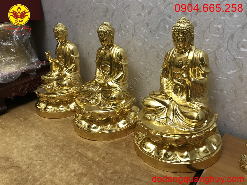 Tam thế phật dát vàng 9999 cao 42cm sắc nét và tinh xảo . Đồ Đồng Quang Huy chuyên nhận đúc Tượng Phật Bằng đồng, bằng đồng mạ vàng, dát vàng. Hãy đến với chúng tôi !