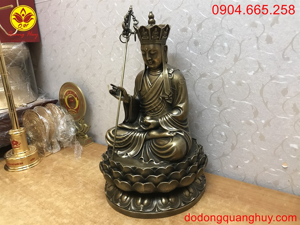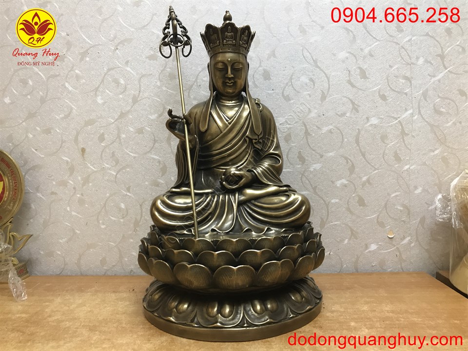 Tượng Phật Địa Tạng với tư thế ngồi thiền định trên đài sen, tay cầm trượng 6 vòng lục đạo được đúc thủ công hoa văn săc nét và diện Tượng đẹp.
